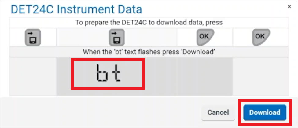 The 'DET24C Instrument Data' dialogue window now appears, with instructions on how to prepare the tester to download